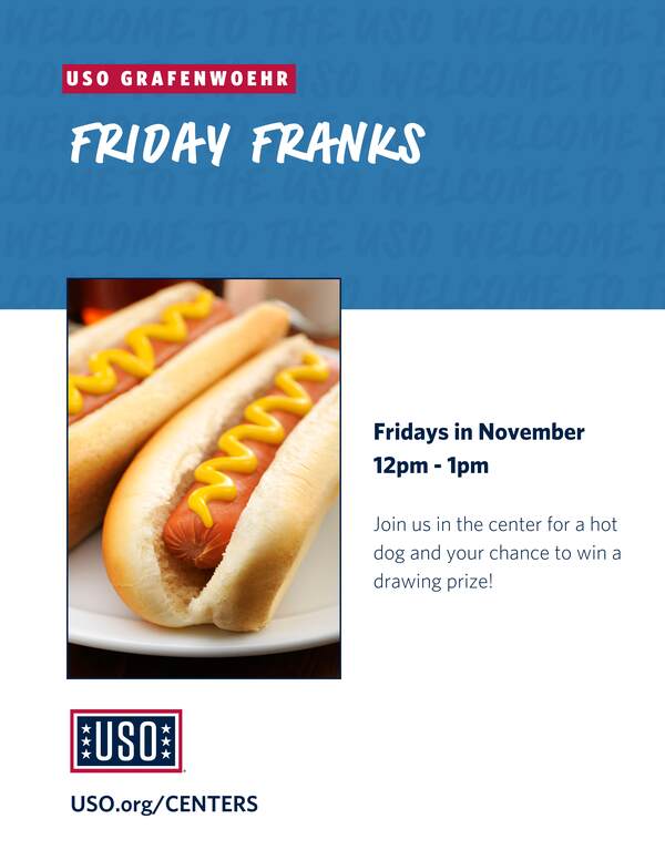 Join us every Friday at lunchtime for Weekly Friday Franks at USO Camp Aachen! Take a break, grab a hot dog, and kick back with your fellow service members in a relaxed, welcoming atmosphere. Whether you’re here to chat, recharge, or just enjoy a ta…