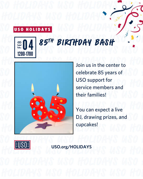 USO Grafenwoehr invites our amazing military community to join us as we celebrate 85 years of USO Support for US Service Members and their families. Join us in center for cupcakes, a live DJ, and birthday gifts (drawing prizes). The celebration starts at 1200 hours.